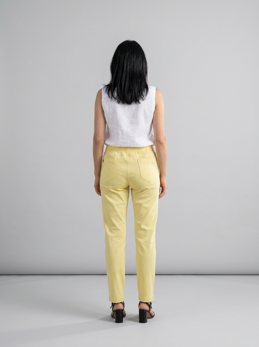 Spodnie wykonano z elastycznej bengaliny, która dobrze dopasowuje się do sylwetki, ponieważ zawiera dodatek włókien elastycznych. Materiał jest miękki i sprężysty, a także przyjemny w dotyku, dzięki czemu zapewnia wygodę przez cały dzień. Elastyczny pas w talii ułatwia dopasowanie, a jednocześnie zapobiega uczuciu ucisku.
